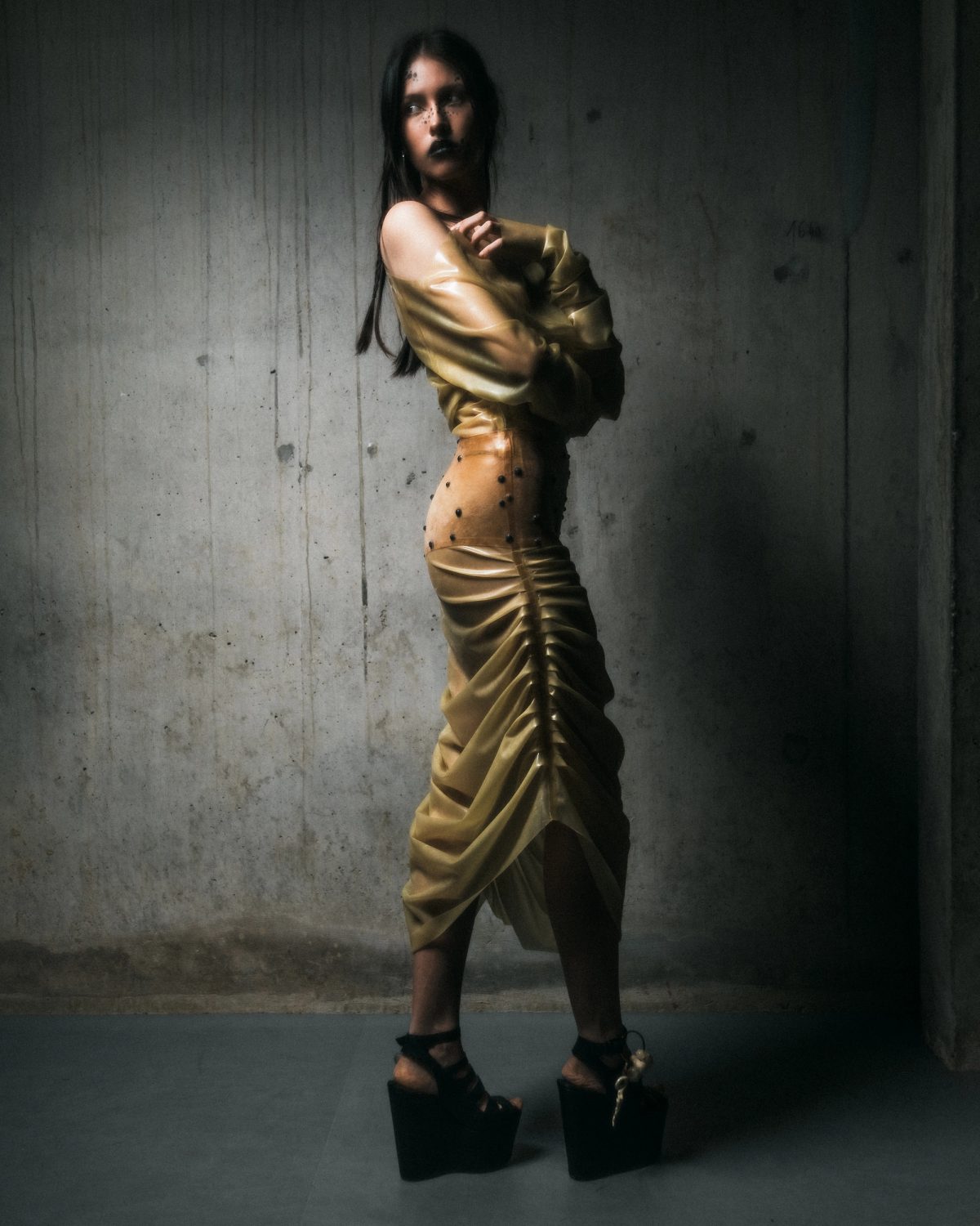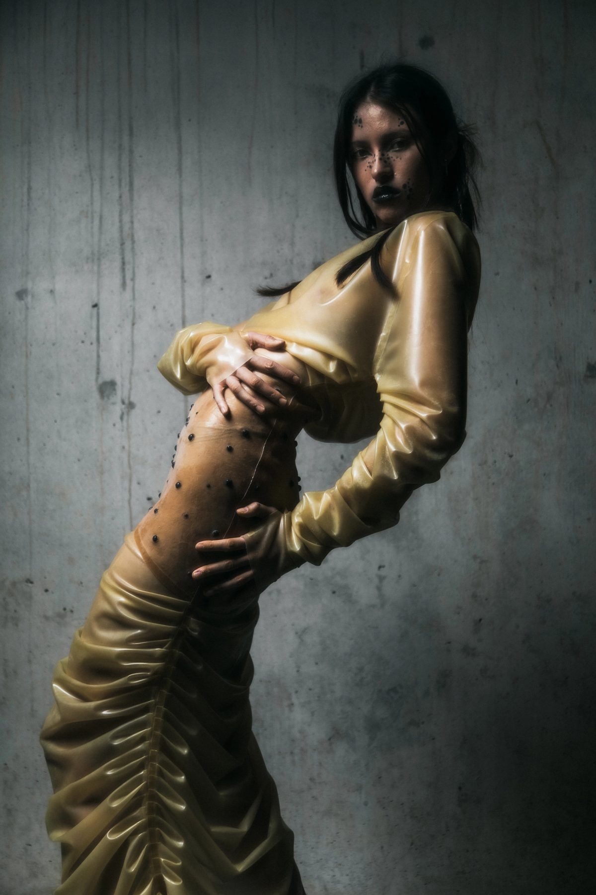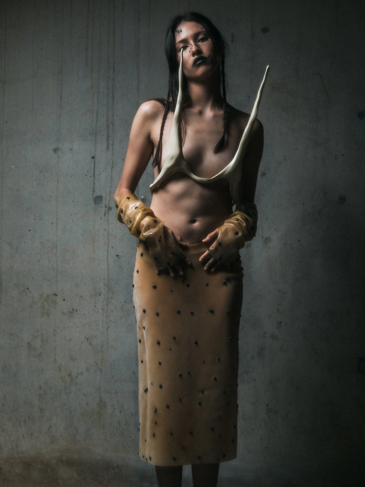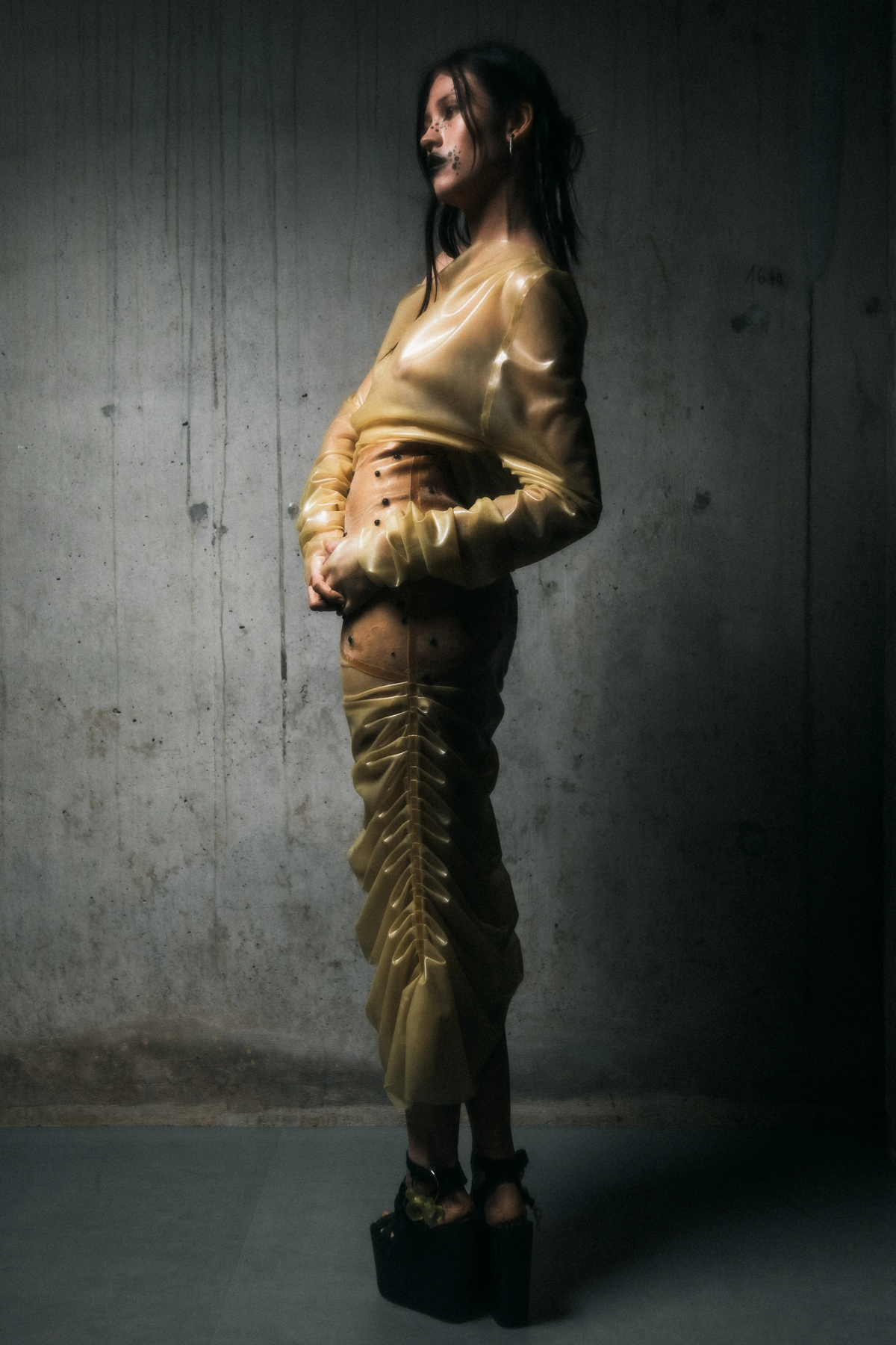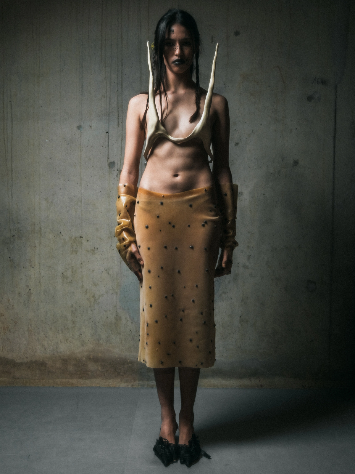 The clothes are excavations and weapons at once. Latex, poured by hand, hardens like skin that remembers its own scars; beads cling to it like remnants of ritual, like parasites, like armour.