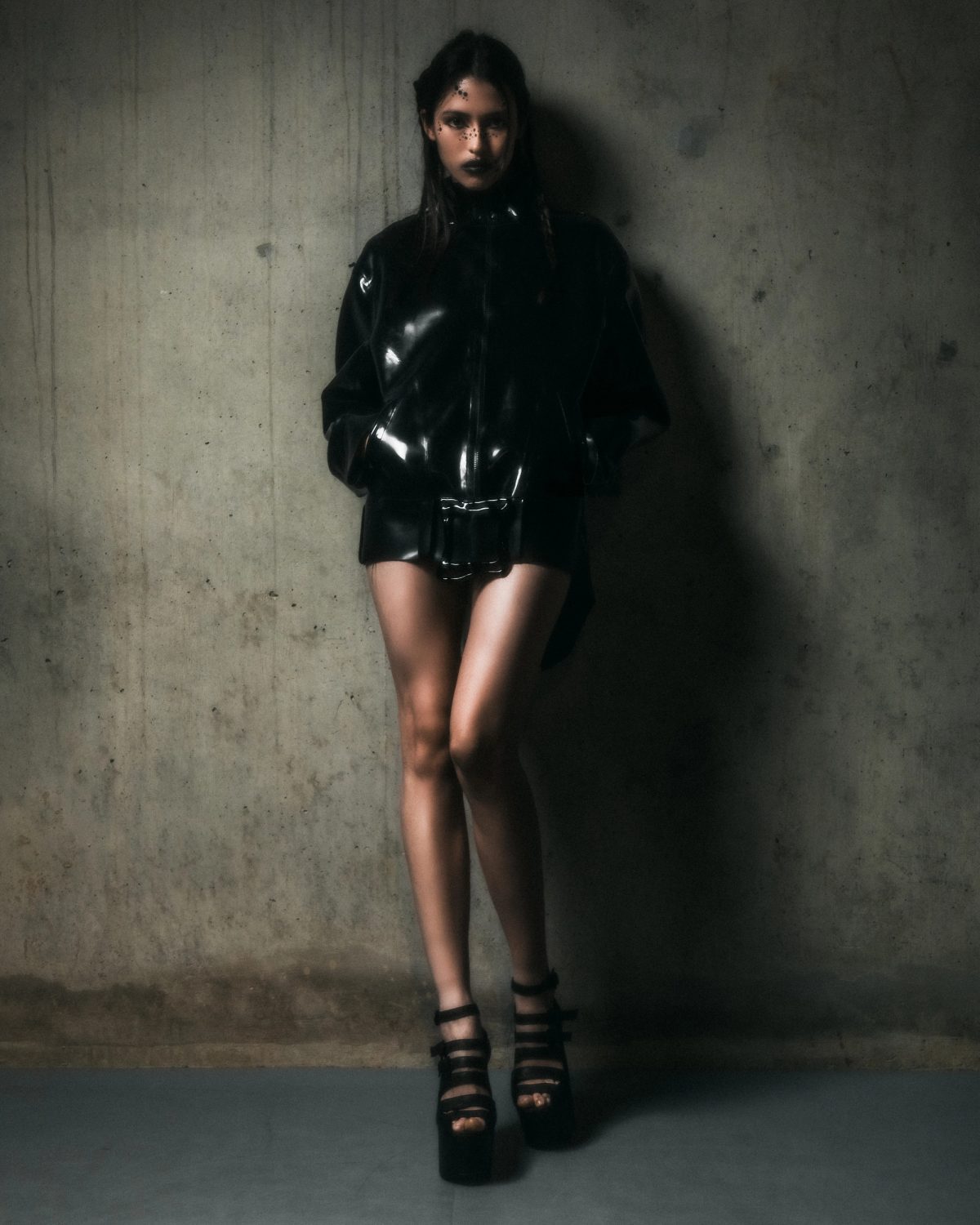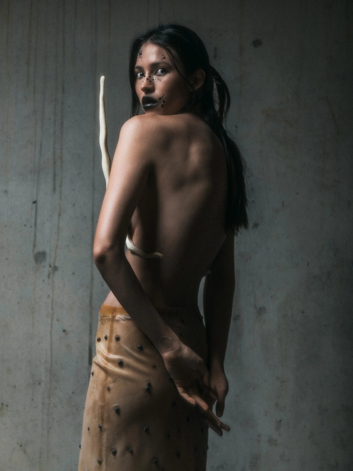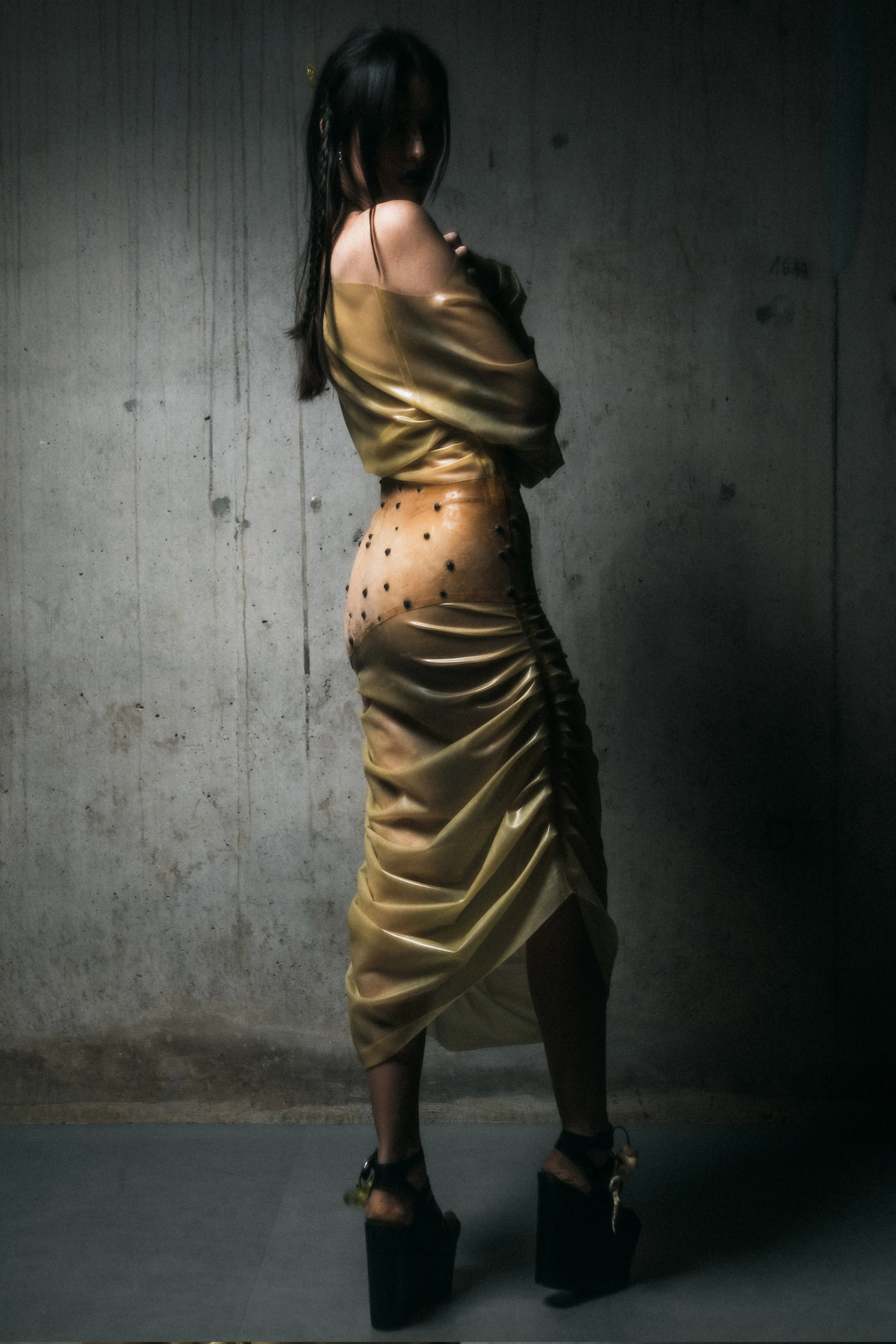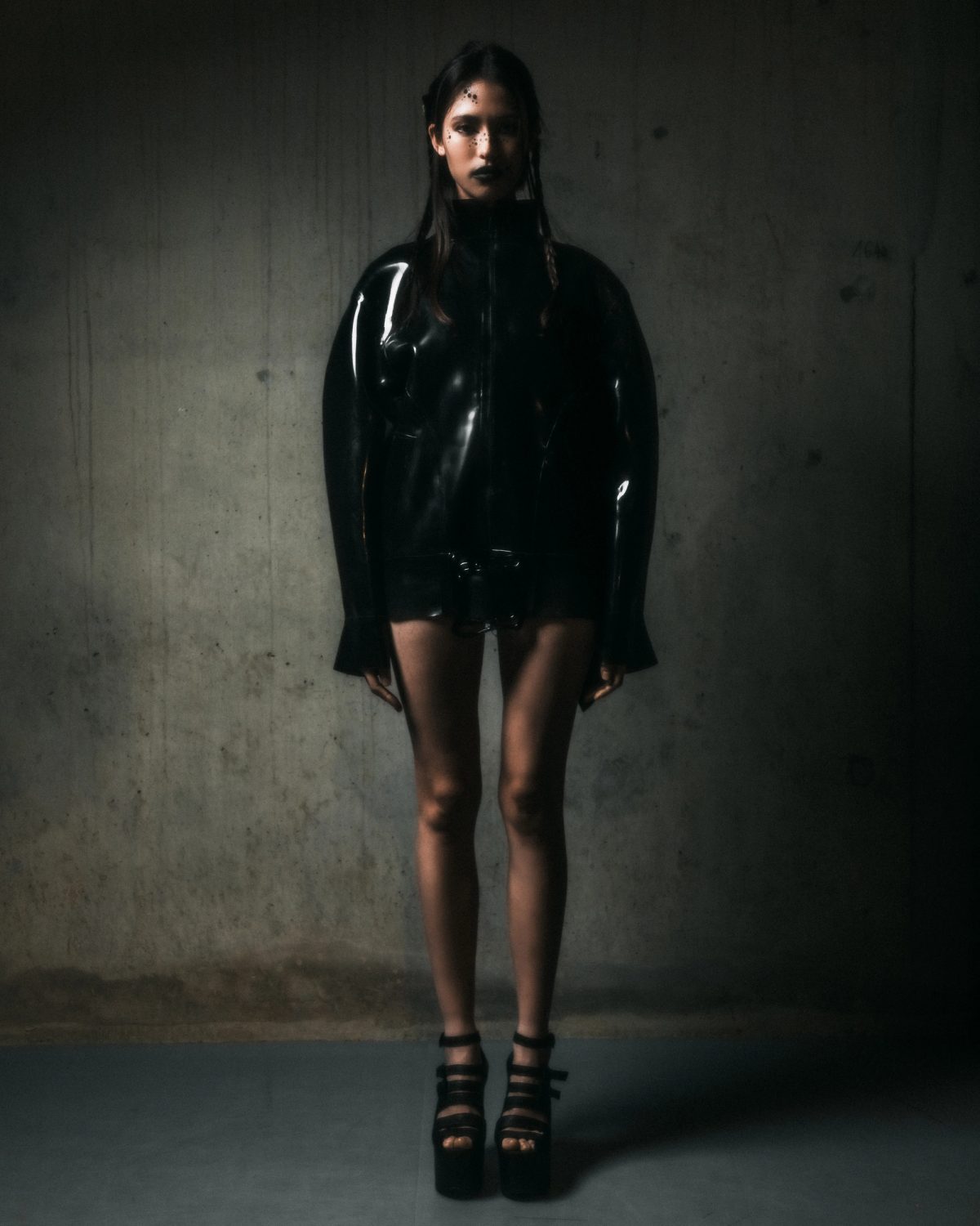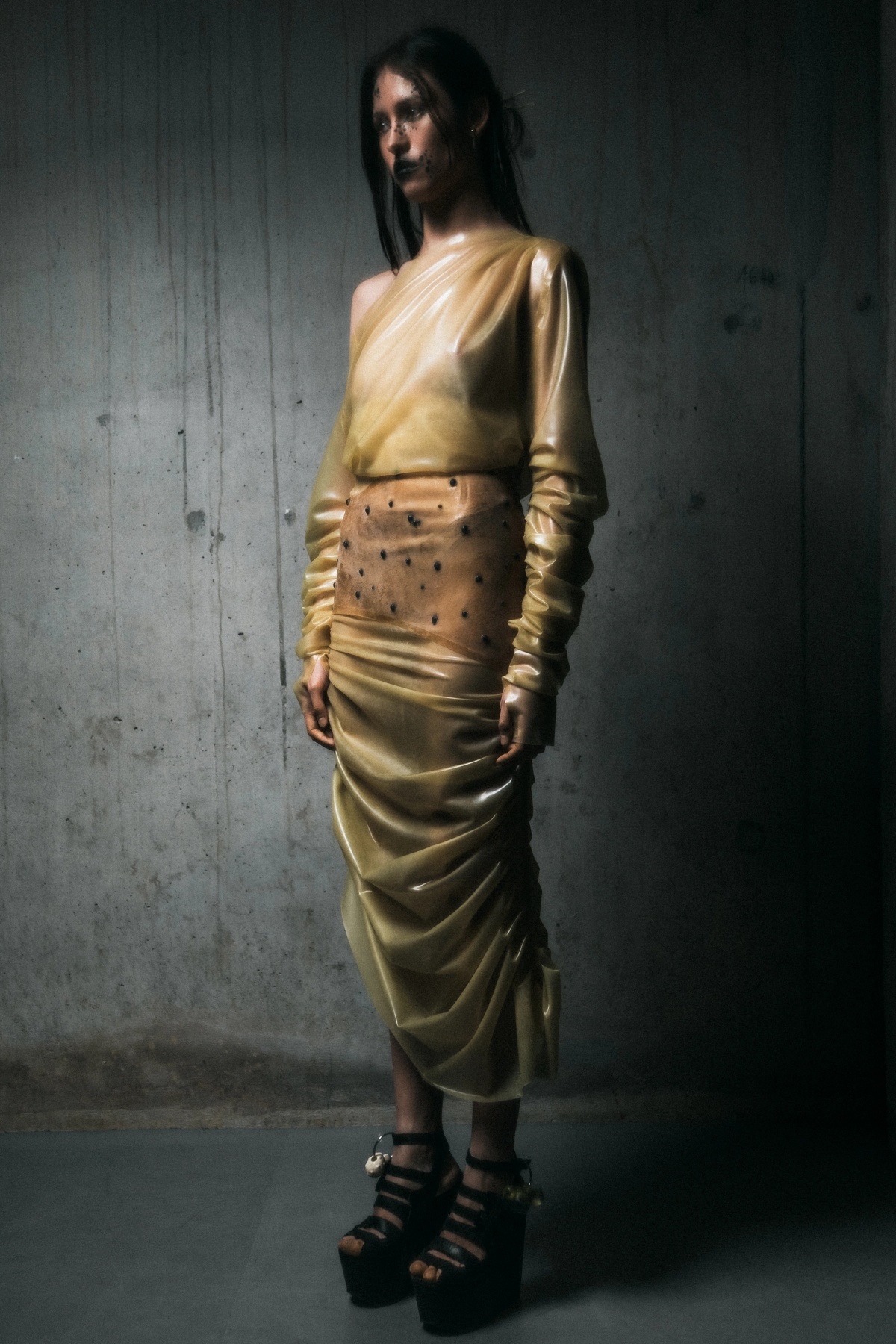 The clothes are excavations and weapons at once. Latex, poured by hand, hardens like skin that remembers its own scars; beads cling to it like remnants of ritual, like parasites, like armour.