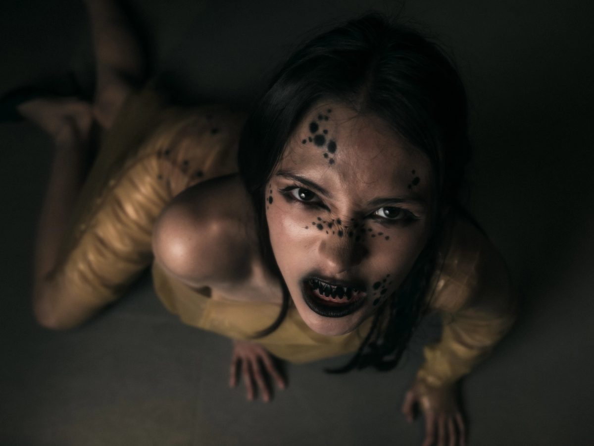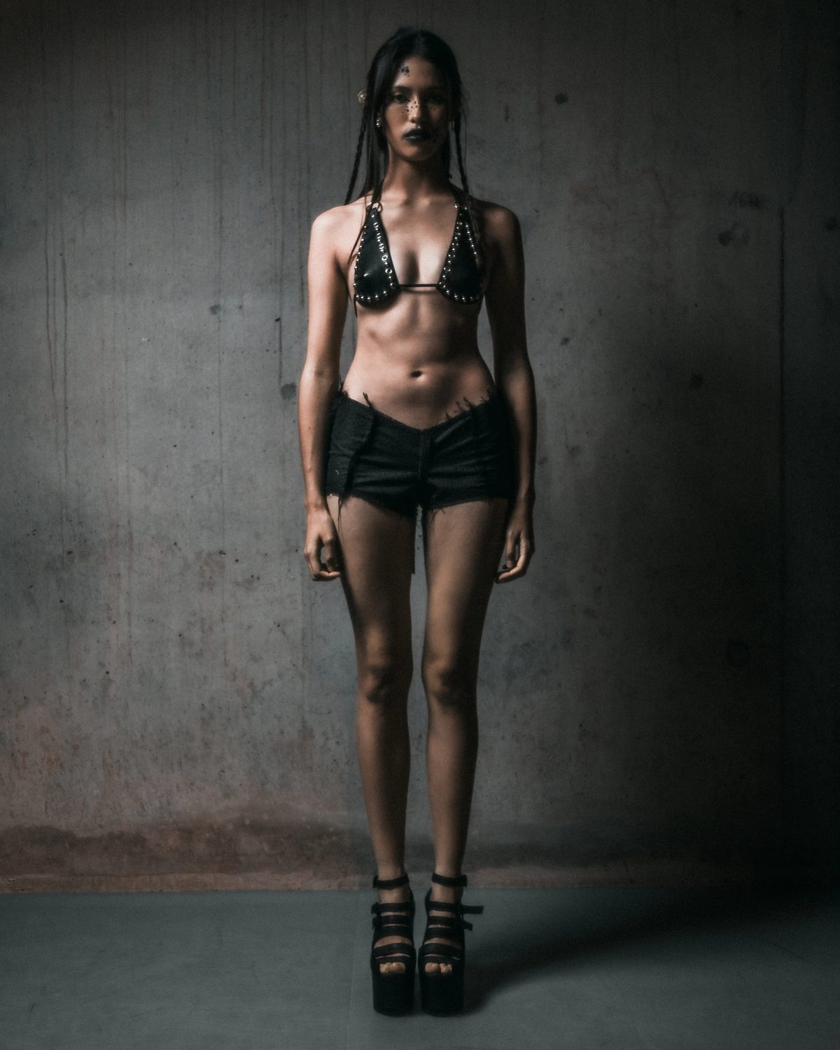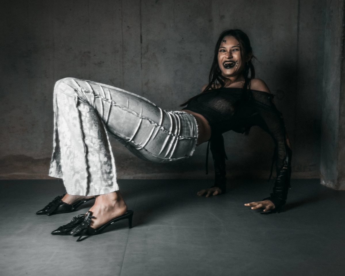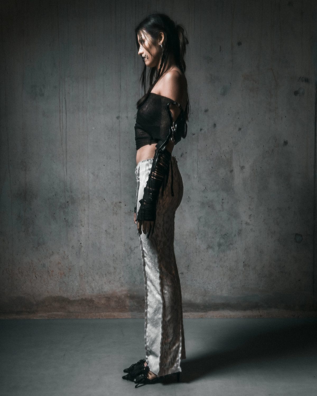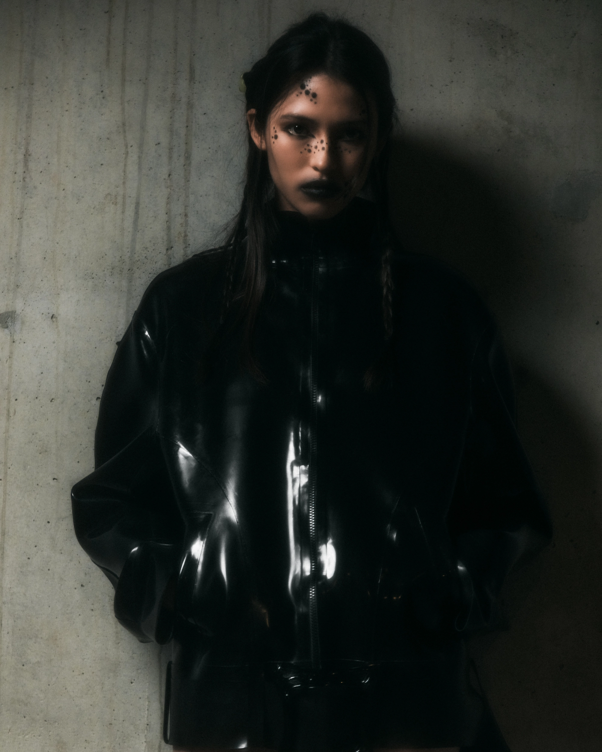 The clothes are excavations and weapons at once. Latex, poured by hand, hardens like skin that remembers its own scars; beads cling to it like remnants of ritual, like parasites, like armour.