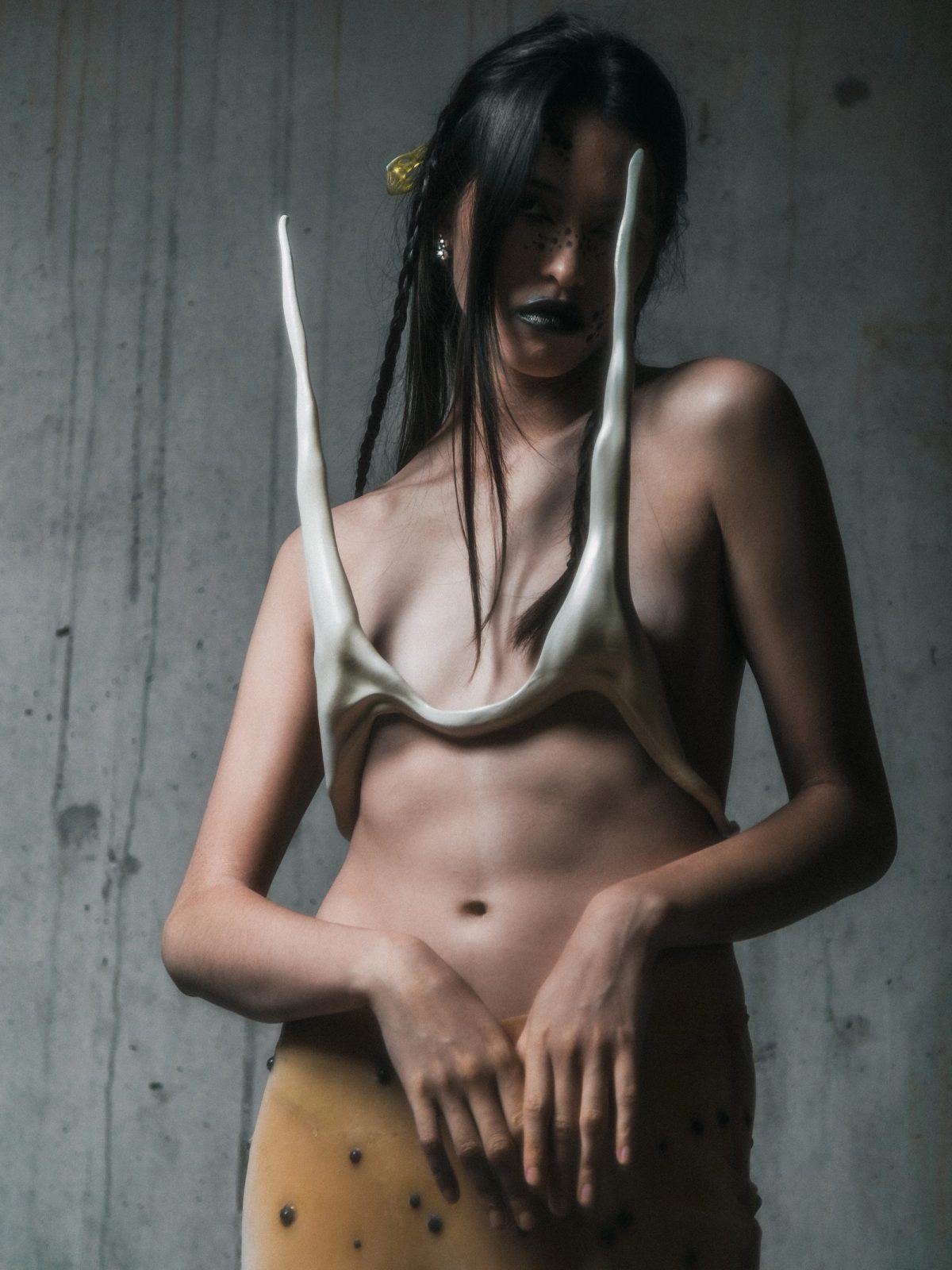 Draping feels ancient, but cut open, reversed, exposed, refusing the comfort ofcompletion, makes the hidden visible. A bra is no longer lingerie, but a fossil, printed into form. Fragile artefacts of an extinct future tribe.