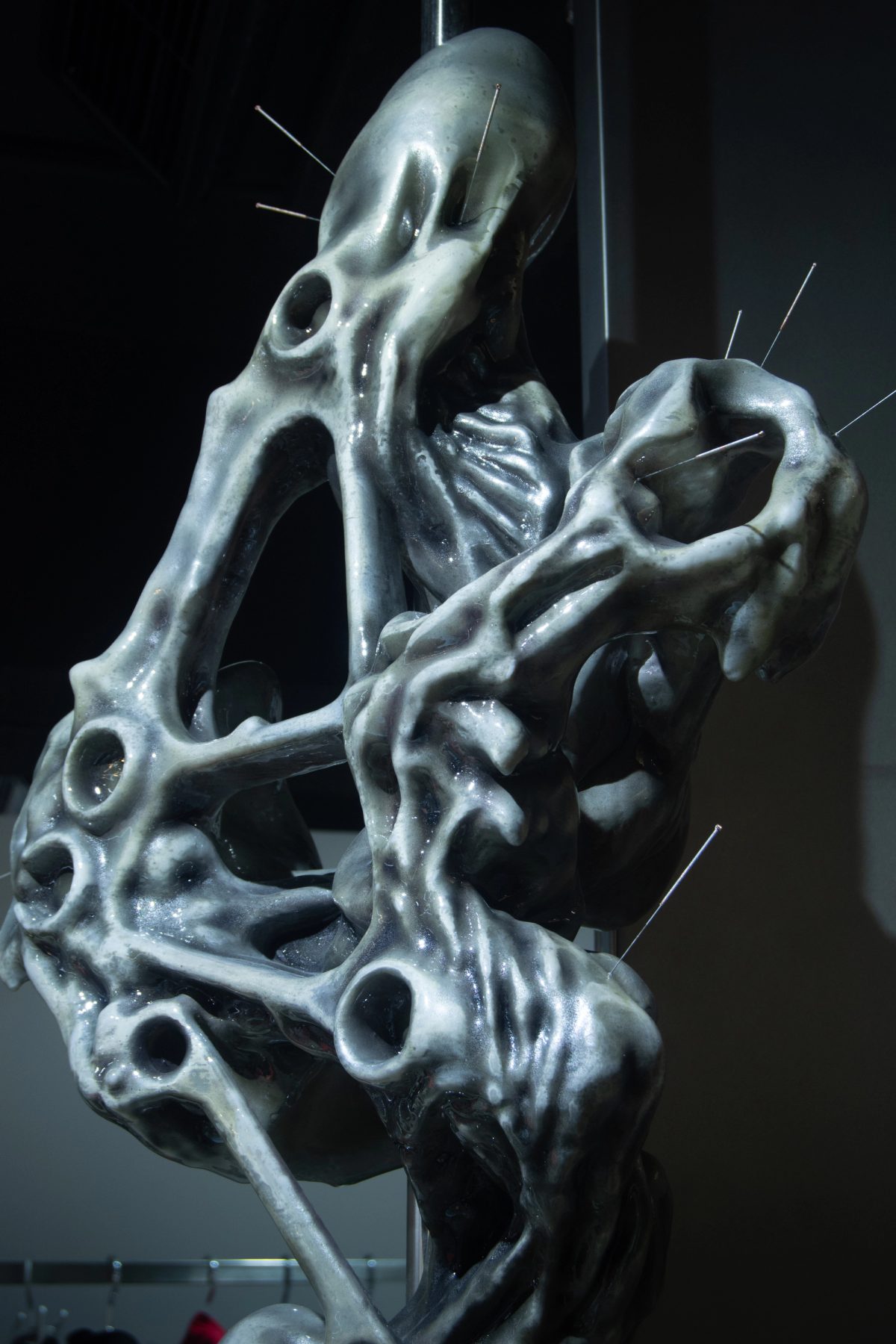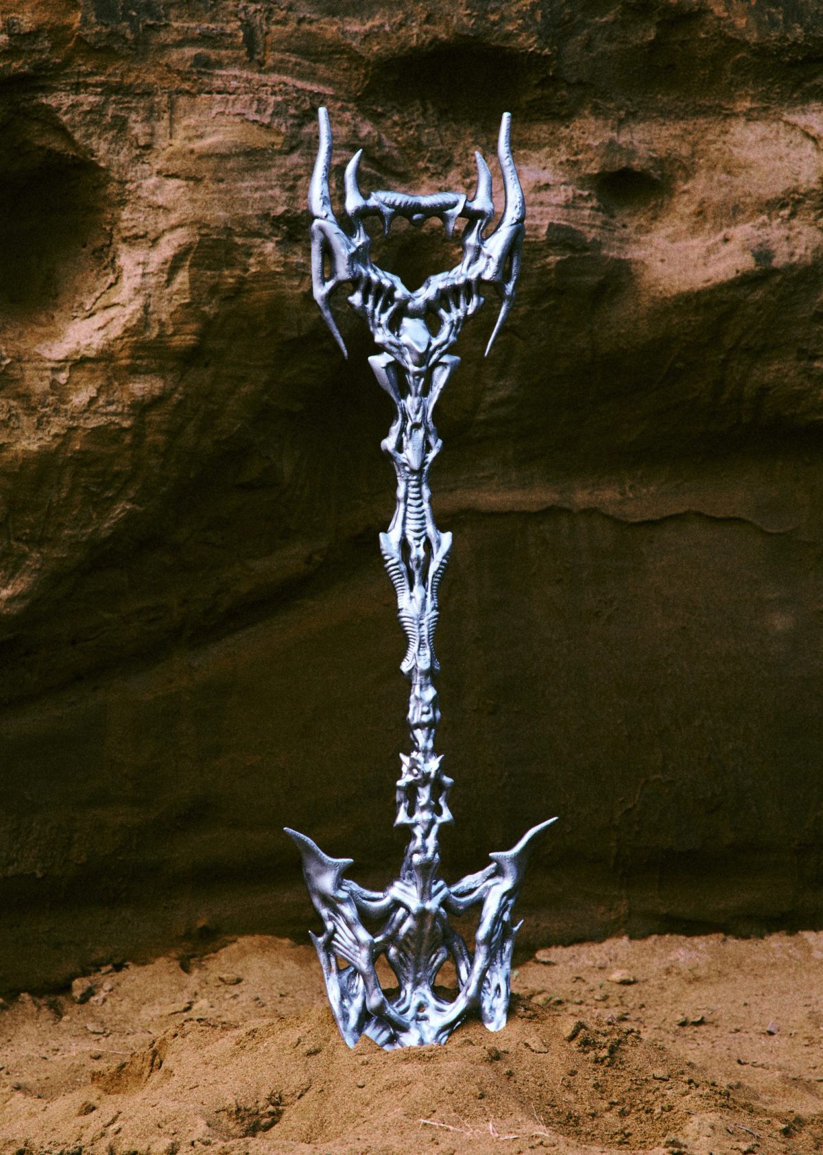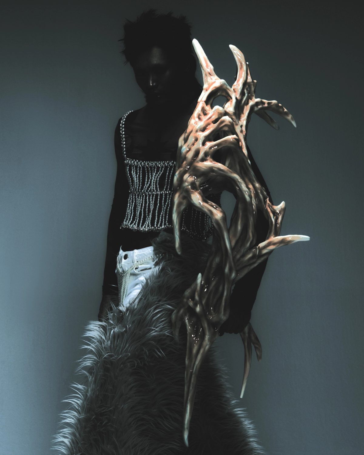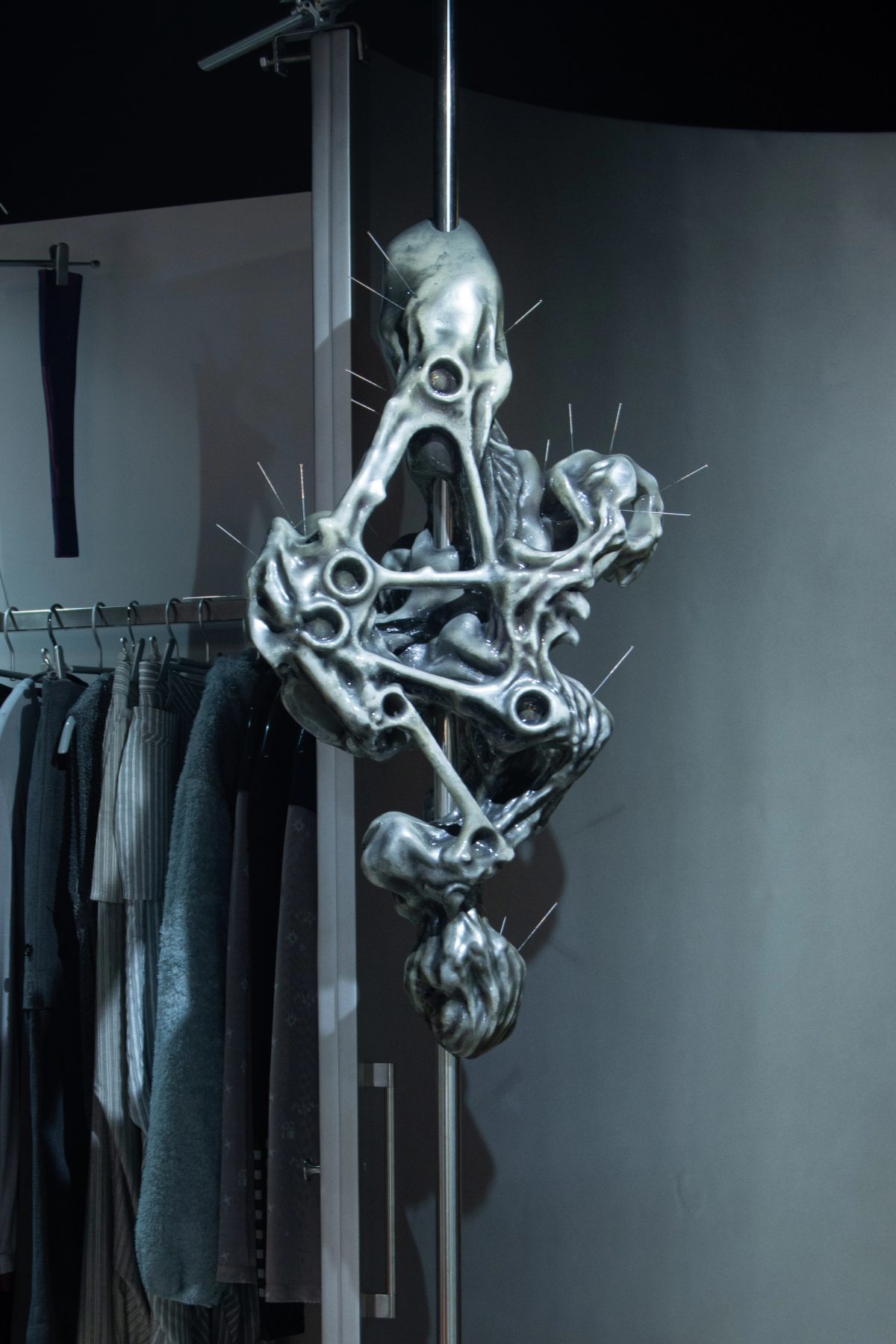 Many of your pieces feel like organisms caught between growth and decay, steel and skin. How do you think about material life, especially when you work with resin, chrome, and code?