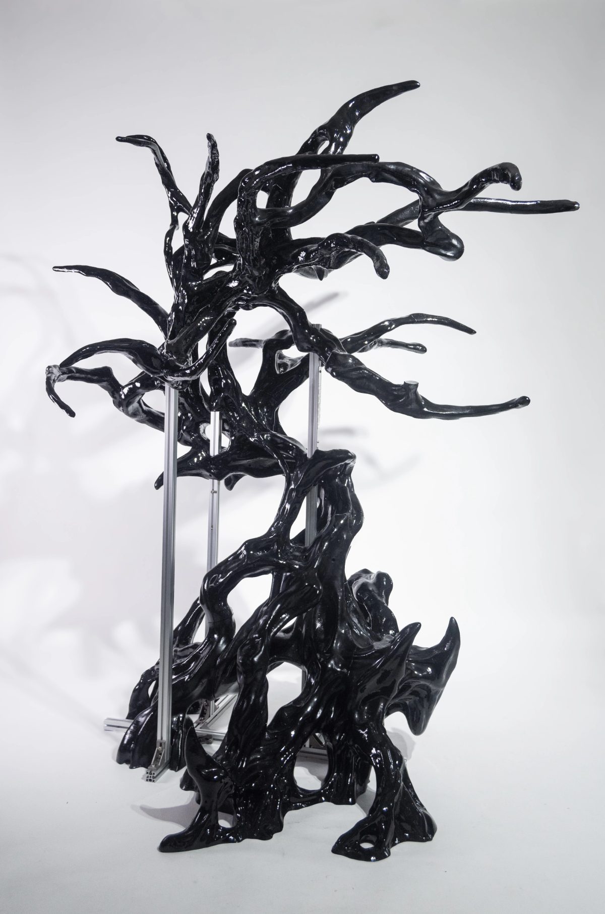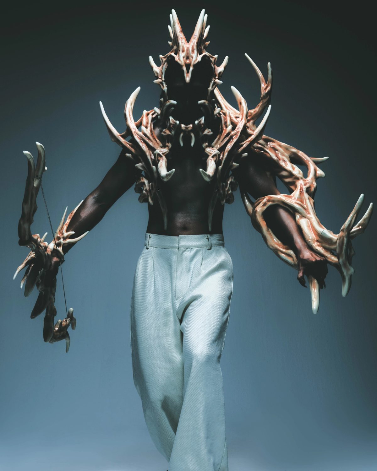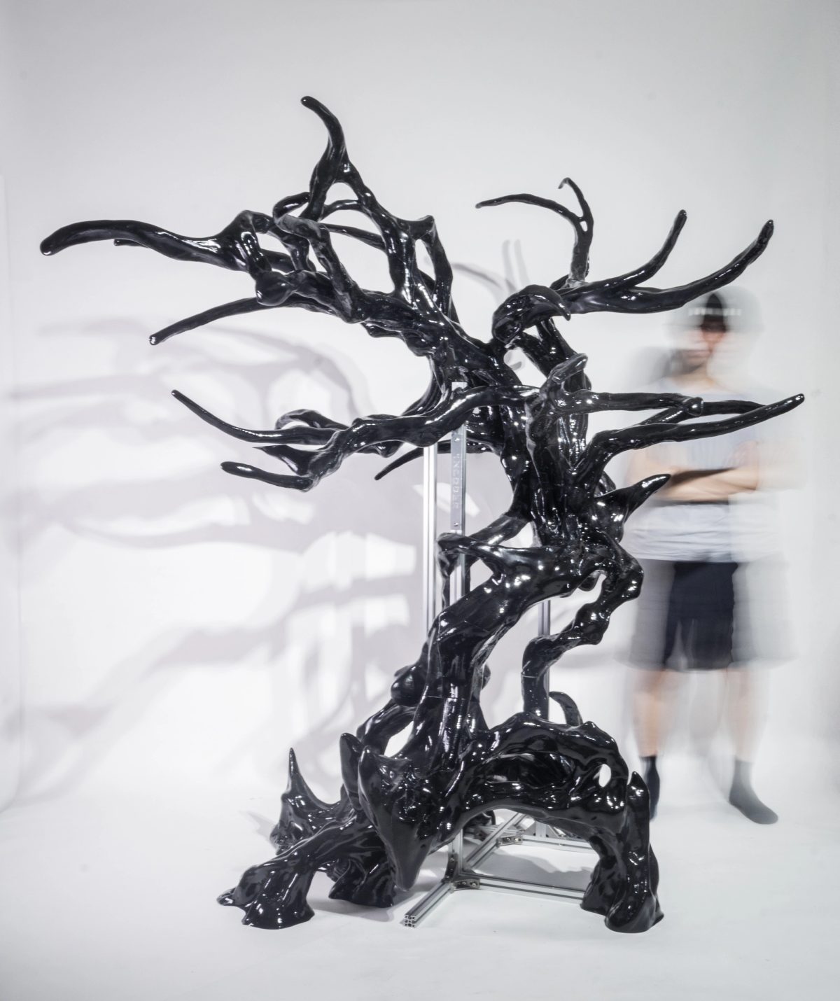Many of your pieces feel like organisms caught between growth and decay, steel and skin. How do you think about material life, especially when you work with resin, chrome, and code?