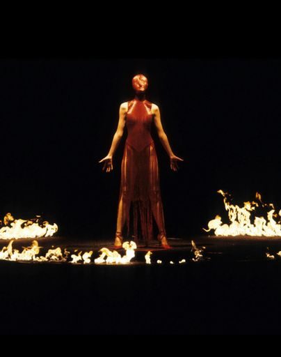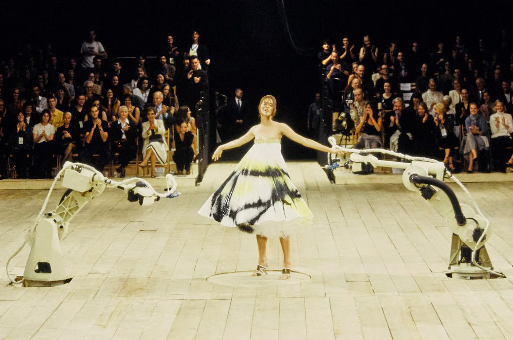 For his 1998 Fall collection Joan, McQueen ended the show with a masked model in a blood-red dress standing in a ring of fire, symbolizing Joan of Arc, the collection’s namesake. His Spring 1999 collection, titled No. 13, witnessed several iconic moments as well. Paralympic athlete Aimee Mullins walked the runway with wooden prosthetic legs, and supermodel Shalom Harlow, standing on a rotating platform, was spray-painted by two robots on stage, just part of what made the performance so impactful.